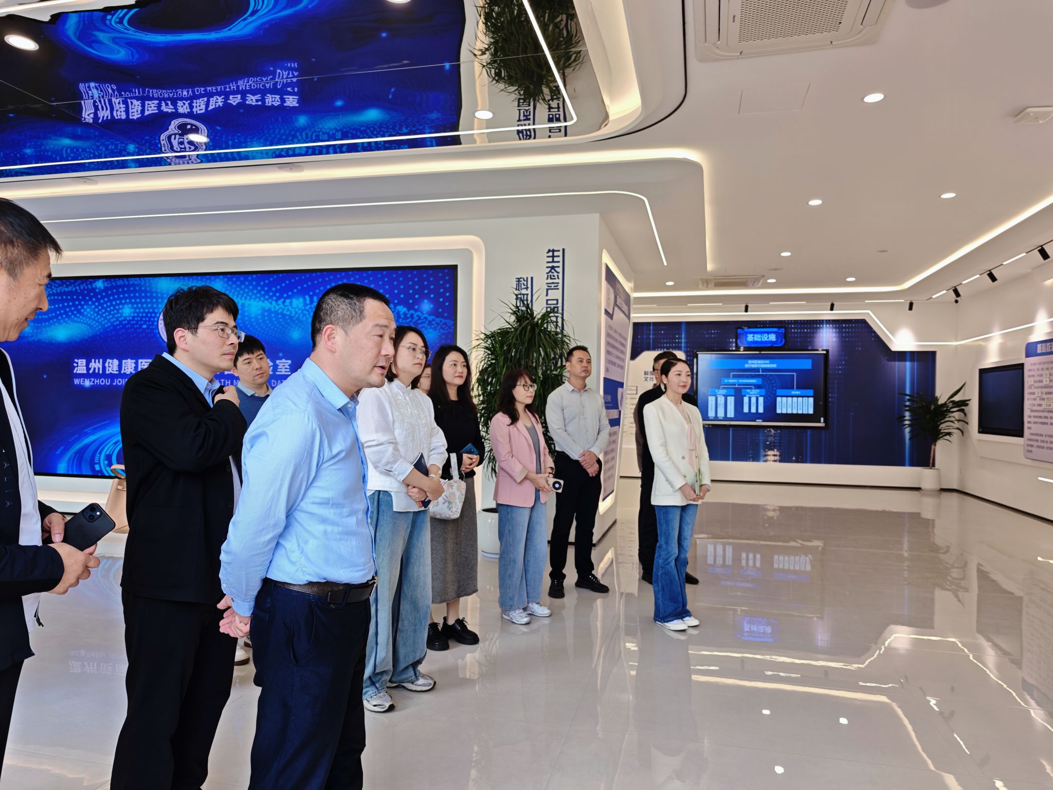 在数安港工作人员的引导下,师生一行参观了数安港联合实验室主展厅,系统了解温州以数安港为依托,构建 “九个一” 数据安全与要素流通体系、承接国家(温州)健康医疗数据联合实验室建设、深化医疗健康数据要素市场化配置与成果转化的创新实践,直观感受温州在数据安全治理、可信数据空间、医学 AI 评价评测等领域的前沿布局与 “温州经验、温州样板” 的实践成果。