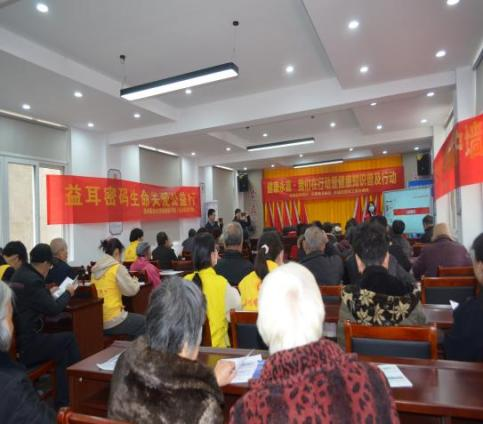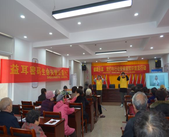 “护耳有道”护耳保健操教学。活动开始,志愿者结合PPT和亲身示范向群众讲解护耳保健操的做法,并发放益耳宣传手册。整个过程中志愿者们耐心细致演示规范流畅,教学取得良好效果,帮助在场群众提高了对耳部健康的重视,有效预防耳部疾病。