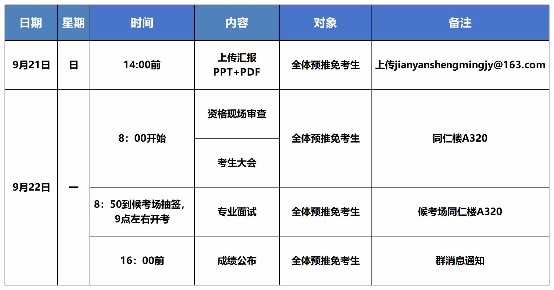 (四)提交个人陈述环节汇报PPT到邮箱[email protected],汇报PPT需同时制作成PDF版本,两者均以报考专业+姓名+考生编号命名,在9月21日(星期日)14:00前打包为一个文件夹发送到jianyanshengmingjy@163.com,材料一经发送,不接受修改。PPT具体内容要求详见第四点复试内容。