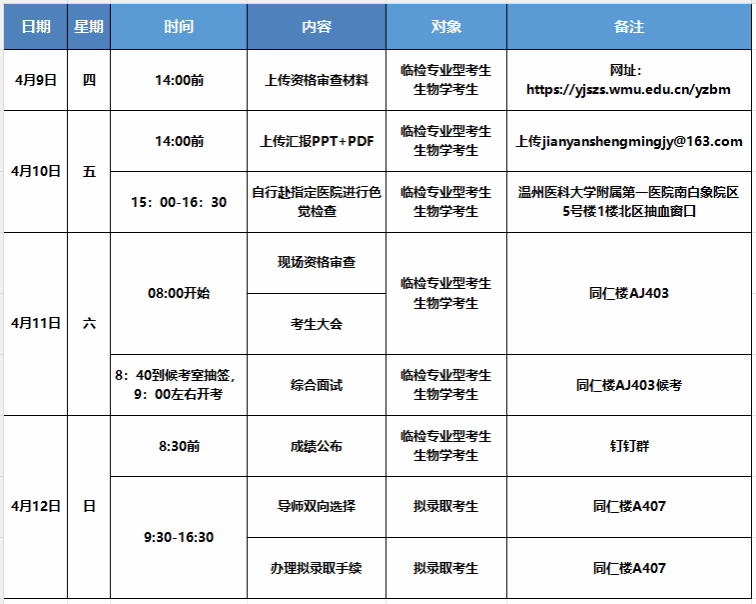 所有考生需携带现场资格审查材料于4月11日(周六)早上8点前至温州医科大学茶山校区同仁楼AJ403报到,进行现场资格审查,上交《温州医科大学攻读硕士学位研究生思想政治情况表》原件、《温州医科大学2026年诚信复试承诺书原件》,参加考生大会。
