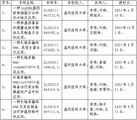 附件:温州医科大学科技成果转化公示表-“一种lncRNA基因修饰细胞分泌的外泌体及应用”等6项发明专利权转让